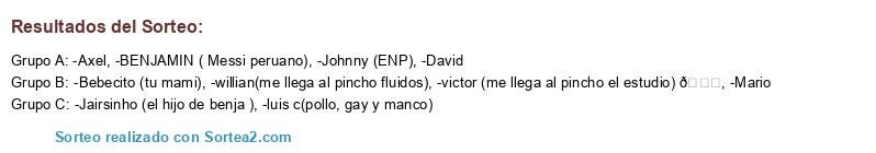 Lista de participantes: -BENJAMIN ( Messi peruano), -willian(me llega al pincho fluidos), -victor (me llega al pincho el estudio) 🙂, -David, -luis c(pollo, gay y manco), -Johnny (ENP), -Bebecito (tu mami), -Jairsinho (el hijo de benja ), -Axel, -Mario.