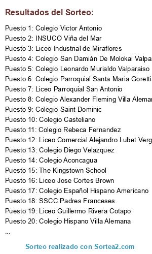 Lista de participantes: Liceo Guillermo Rivera Cotapo, Liceo Bicentenario Viña del Mar, Liceo Industrial de Miraflores, Colegio Casteliano, The Kingstown School, Liceo Parroquial San Antonio, Colegio Claudio Matte, Liceo Jose Cortes Brown, Colegio Español Hispano Americano, Colegio Diego Velazquez, INSUCO Viña del Mar, Colegio Rebeca Fernandez, Colegio Saint Dominic, SSCC Padres Franceses, Colegio Parroquial Santa Maria Goretti, INSUCO Valparaiso, Instituto Tecnico Profesional Maritimo de Valparaiso, Liceo Eduardo de la Barra, Colegio Leonardo Murialdo Valparaiso, Colegio Alborada de Curauma, Colegio San Damián De Molokai Valparaíso, Colegio Victor Antonio, Liceo Comercial Alejandro Lubet Vergara, Colegio Los Reyes Quilpue, Colegio Aconcagua, Colegio Hispano Villa Alemana, Colegio Alexander Fleming Villa Alemana, Colegio Winterhill.