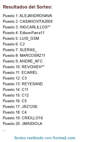 Lista de participantes: ESTEVAN910, REVOIXEH**, INGCARLILLOS**, AGUILA_MAJROB**, VIVASOSCAR15, MARCOSRZ11, EdisonParra11, JORGE1991BAS**, JRZ1200, JMINDIOLA, VEROCRB, CASANOVITA2009, CRIOLLO16, SLERAS_, RUDDYGMC6932, ERRCAFU, ALEJANDRONAVA, REYESAND, ECARIEL, ANDRE_AFC, LUIS_GSM, C1, C2, C3, C4, C5, C6, C7, C9, C10, C11, C12.