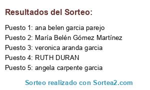 Lista de participantes: aarón alfonso villalba, ADELA FLORES GALLEGO, Adolfo Burgos Gálvez, ADRIAN GARCIA GARCIA, adrian mata manzanera, África Romero Salgado, agustin aguerri, Agustin Ortega Garcia, Aida Cortizas Rodriguez, ALBA RUBIO, Albert Schneider, A. D. L. N., Alberto Vidal Troitiño, Alejandra Febles Viñas, alejandra ferrero barros, alejandra saanchez altamirano, Alejandra San Jose, Alejandro Samuelle Silveira, alejandro sierra sanchez, Alexia Cambre Ventura, Alfonso Perez Perez, Alfredo Garcia Heredia, alicia alonso martinez, Alicia Carrero Marcos, ALICIA JORGE PALOMAR, Alicia Juste Gilabert, Alicia Laquestaqui, Alicia Montoro Menjibar, alicia navarro, Alicia Pozo García, alicia roman castaño, Alicia Sánchez García, almudena arocha martos, Almudena González González, almudena kuna mamolar, almudena lopez gutierrez, Almudena Martínez-Palafox, almudena serrano vargas, Álvaro Embeita Puerts, alvaro pardal, amalia melian, amaya de juan blanco, Amaya Navarro Garrido, AMPARO FERNANDEZ MOMPO, amparo moreno sampedro, Amparo Pérez Vélez, Ana Andreu Alcaide, ANA ANDREU ALMARCHA, Ana Ballestero Ballestero, Ana Belén Campaña Fernandez, ana belen garcia parejo, ana belen lopez rodriguez, ana belen martin, Ana Belén Mo Es, Ana Belen Nevado, Ana Belén Pérez Blanco, Ana Belén Quiroga López, ANA BELEN RODRIGUEZ MANSILLA, Ana Belen sola lopez, ana c saenz, Ana Carvajal, ANA CORDOBES LEON, Ana Cris Fernández, ana cristina sanchez peña, Ana cuartero, Ana Domínguez, Ana Fernández Caro, ANA GARCIA, Ana González Aira, ana herrera, Ana Ibañez Salces, Ana Inmaculada (Hadaly Rodriguez en FB) Navarro Rodriguez, Ana Isabel GOnzález Cabado, Ana Isabel Gonzalez Martinez, ANA ISABEL MARTÍNEZ LOBÓN, Ana Isabel Sierra garcia, Ana Isabel Tapia del Hoyo, Ana Jiménez castelló, ana maria castañeda pozo, ANA MARIA DUEÑAS CABELLO, ANA MARIA FURIO, Ana María González Otero, ana maría guerreiro correia, Ana María Gutiérrez González, ana maria merino chacon, ana maria navas calero, ana maria ramos, ana maria ramos rodriguez, ANA MARIA ROMERO GONZALEZ, ana maria sanz hillan, Ana María Valera Gil, ana maria vento marco, ana mart, Ana Ministro, ana molino, Ana Moreno Rosales, Ana Nuñez Lopez, ana perezsalvador, Ana Radigales Navarro, Ana Rey, Ana Sanchez Copete, Ana Sánchez Torés, ANA SOTOS RODENAS, Ana Unanyan Ruzafa, Ana Vegara, anabel blanco, ANAI ARBIOL MARTINEZ, Anastasia Lidzhieva, andrea fernandez, Andrés Pérez Pérez, Angel Chacon, Angel Garcia Lopez, Angel Pardina Gascón, angela carpente garcia, angela garcia conesa, Angeles Fernandez Fernandez, angeles gimenez sanchez, Angeles Gutierrez Espinosa, Anna Balabanova, Anna Mejias, antonia morales salas, ANTONIA RUEDA MURILLO, ANTONIO ALARCON LOPEZ, ANTONIO Rodriguez Melcón, antonio sierra guerrero, arabia acosta rodriguez, aracely Hernández, Arantxa Ortiz Radio, Arantxa Sanjuán Lagraba, aranzazu rodriguez moreno, Aroa Ortiz López, Arrate Graciano Domingo, ASCENSION ANDRES RAMO, astrid alonso fernandez, asun loscos horno, Aurora F.G, AZUCENA DE PAZ PASCUAL, Azucena Gallego Palomino, Barbara Martin Peinado, barbara simon gomez, Bea Paredero, Beatriz Aparicio Rubio, Beatriz Begara Garrido, Beatriz Cáceres, beatriz castellanos, Beatriz de Leon Trujillo, Beatriz de Toro Elizalde, Beatriz Dominguez Tapiador, Beatriz Felipe, Beatriz GONZALEZ, beatriz jimenez, BEATRIZ JULIAN NOGUEIRA, Beatriz López Palacios, Beatriz Lopez Serrano, beatriz marcos, Beatriz Muela Martínez, Beatriz Muradás, Beatriz Pérez, Beatriz Pola Corral, beatriz ramirez fouz, BEATRIZ rodriguez ablanedo, Beatriz Ruiz, begoña carrasco virto, begoña collazo ortega, Begoña De La Casa, Begoña Franco Garcia de Cortazar, BEGOÑA LATORRE VILORIA, Begoña Ortega Morales, Begoña SANCHEZ FERNANDEZ, Begoña Tornero, Belen Caballero, Belen Gallego, BELEN LORENZANA AGUDO, belen moreno, Belén Navarro Narváez, Belén Primitivo horcajo, bene escribano, Berta Ferreirós, bibiana castro buadas, Blanca Juliana González González, brigida rodriguez, C.Isabel. ambrona, Candido Lopez Caparros, CARLA ILLANA FERRER, Carlos Baragaño Garcia, carlos francisco ríos odero, carme canti, carme cantí, Carmen Álvarez, carmen ciuca, carmen dominguez abeledo, carmen ferris alonso, carmen Galnares guerra, carmen garrido diaz, carmen gonzalez garcia, CARMEN HERNANDEZ MARTINEZ, CARMEN LOPEZ GONZALEZ, carmen lucas, Carmen Luis, carmen Martínez, carmen pajuelo hernandez, Carmen Rojo, carmen salas, carmen santana borrero, CARMEN VARGAS ALARCÓN, CARO Fernández Antón, carolina cruz, carolina esteve, Carolina Estevez, Carolina Madrid García, Carolina Peña, Carolina Pozo García, CAROLINA QUINTERO DOMINGUEZ, carolina rios sanchez, CAROLINA SANTAMARÍA ROA, CAROLINA VIVO, Catalina Colorado Olveira, Catalina Comas Borrás, celeste malheiro aly, celeste sancho castro, celia lopez, celia martin diaz, charo González Saráchaga, cinthya heredia, claudia rueda rodriguez, Claudia Vozmediano Hernandez, clemen de rus, CONCEPCION FERNANDEZ, concepcion lajarin lopez, concepcion matias simarro, CONCEPCION RIVERA GIL, CONCHA SEGARRA ARNAU, conchi garcia nieto, conchi Lasmarías, CONSUELO CASTRO, Covadonga Romero, cristhy fitas, CRISTINA Alvarez Gomez, Cristina Antelo Arcas, Cristina Añon Rodriguez, Cristina Aymerich Dolhaberriague, CRISTINA Banzo, cristina contreras, Cristina Dembilio Morote, CRISTINA ETAYO SANCHEZ, Cristina Ferreras Mora, cristina gutierrez hernandez, CRISTINA JURADO, cristina lopez, Cristina Masia, Cristina Mendez Matelo, cristina molinero, cristina navarro (Crisnasa Blog), Cristina Obrero Bueno, cristina pardo, cristina priego lapeña, cristina rodriguez fernandez, Cristina Sánchez Gavira, cristina sevilla, cristina silva volta, Daniel Ruiz Cano, DAVID lapuente Romero, DAVID VARGAS MORENO, Dayana Fosado, Debora Gutiérrez, debora segarra, Déborah Taboas, delia ibañez jimenez, Diamarys Camperos, Diana Sarmiento, diego ayala marquez, Dolores Lopez Perez, dolores ruiz teje