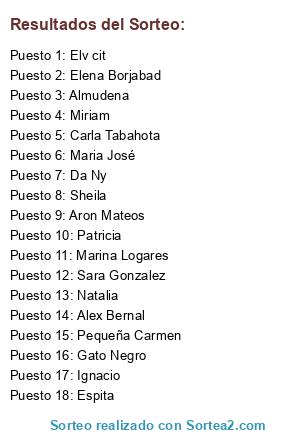 Lista de participantes: Pequeña Carmen, Elv cit, Almudena, Sheila, Gato Negro, Elena Borjabad, Carla Tabahota, Sara Gonzalez, Aron Mateos, Alex Bernal, Marina Logares, Espita, Maria José, Da Ny, Patricia, Natalia, Ignacio, Miriam.