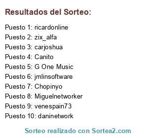 Lista de participantes: Miguelnetworker(33 participaciones), ricardonline(23 participaciones), carjoshua(11 participaciones), daninetwork(11 participaciones), jmlinsoftware(11 participaciones), G One Music(11 participaciones), venespain73(11 participaciones), Chopinyo(8 participaciones), zix_alfa(7 participaciones), Canito(6 participaciones).