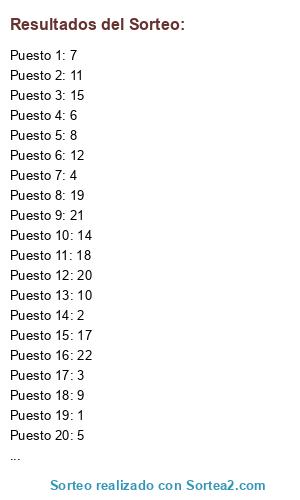 Lista de participantes: 1, 2, 3, 4, 5, 6, 7, 8, 9, 10, 11, 12, 13, 14, 15, 16, 17, 18, 19, 20, 21, 22.