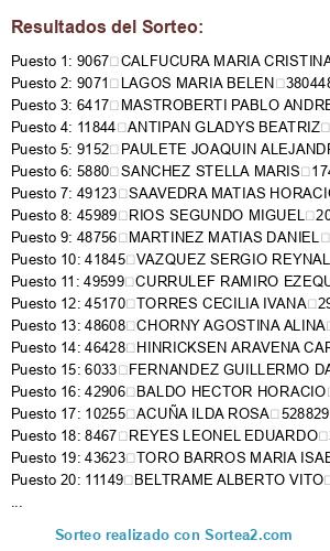 Lista de participantes: 20059 DEL COLLADO HECTOR DANIEL 13750195 , 20037 BELTRAN HEREDIA MARCOS ANDRES 92374645 , 20044 ROMERO PEDRO JULIO 18620120 , 20047 SEPULVEDA JORGE 24104514 , 20054 MENDEZ CARMEN ROSA 14230385 , 20058 MORON MONICA LILIANA 24259916 , 20146 BLANCO MIGUEL SANDRO 16817000 , 20057 MERCORELLI DANIEL LEONARDO 25317599 , 20064 ALEM MARIA SOLEDAD 29235298 , 20066 PEÑA KARINA BEATRIZ 25725947 , 20061 FERRERO SILVINA VANESA 26832890 , 20062 ALTAMIRANO MARCELO DANIEL 25624393 , 20067 CHAVES CLAUDIA PAOLA 25948741 , 20071 CUBERO MAURICIO JAVIER 28972616 , 20072 DE VEGA ROMINA 29418444 , 20073 DALHOFF JULIANA 29145020 , 20081 GUZMAN CORONADO DANIELA ANABEL 32922453 , 20083 HUENOHUEQUE PATRICIA LORENA 28945601 , 20090 SANDOVAL MARCOS ALFREDO 30725862 , 20095 SAGASETA LUCIANA CRISTINA 33197253 , 20096 LLAMBI MARIANGELES 33178972 , 20097 YUCRA DIEGO MOISES ABRAHAM 35311029 , 20105 SANCHEZ ANAHÍ 34662499 , 20112 RUIZ DIAZ CATALINA ELISABET 33510951 , 20104 RUSSO MELISA GISSELLE 31965352 , 20109 MASSARO DIEGO IGNACIO 32699536 , 20110 HINOJOSA ARZE SUELY KAREM 36693353 , 20120 MOLINA GUTIERREZ AGUSTIN GASPAR 37474800 , 20107 CURAQUEO HORACIO MARTIN 29057751 , 20136 OJEDA MARIA GUILLERMINA 30387915 , 20101 JORGE ADRIANA MABEL 34960870 , 20121 PICHUN MARCIA AMANDA 33860917 , 20147 CABANNE JUAN ANDRES 28361974 , 20099 CASANOVA MARIA BELEN 34714517 , 20102 SANTIBAÑEZ SERGIO 35747902 , 20122 PIZARRO HEBE LIZ 34592578 , 20125 VILLAGRA ROCIO YANET 34592313 , 20130 TORRES LEANDRO NICOLAS 36784055 , 20127 GASPARRI JUAN 33610829 , 20137 SAIGG MAYRA AYELEN 34403261 , 20133 OPAZO MATÍAS FERNANDO 38101651 , 20139 SANDOVAL GASTON ARIEL 40818387 , 20140 MANEIRO LUISINA EMILIA 37603680 , 20142 VILLALBA GIACONE, FACUNDO 39681323 , 20143 RUIZ, ANTONELLA BELÑN 39680528 , 20144 LAETTA, CAMILA ROSARIO 42710437 , 20145 TARDIVO ROMINA EVELIN 35864327 , 20148 GONZALEZ, FLORENCIA COREL 38495730 , 20149 MERCADO CARLA AGUSTINA 40612252 , 1103 MORALES NESTOR CESAR 11914186 , 2182 MARTINEZ LUIS OSCAR 16819717 , 4636 BOSQUE HECTOR OMAR 12638147 , 5190 HUENUQUIR JUAN RAMON 18180058 , 5204 CITERONI LUIS ALBERTO 16052405 , 5232 SASTRE MIGUEL ANGEL 17868552 , 5246 DAMELIO DIANA ELISABET 12940594 , 5256 RIVAS STELLA MARIS 17195112 , 5326 HUECHEHUIRCAN MARCELINO RAUL 16829790 , 5470 JARA AMALIA EDITH 17140788 , 5543 BARRERA SANDRA VIVIANA 20793928 , 5546 ESCONTRELA DANIEL OMAR 16251191 , 5548 LOPEZ GLORIA DEL CARMEN 12820321 , 5700 CHOIMAN MARIA CRISTINA 18180454 , 5733 ANTINIR HECTOR ALFREDO 20436086 , 5734 PIFLAC NESTOR LUIS 12895966 , 5751 IZQUIERDO LILIANA MARCELA 20793085 , 5753 ISOLA FABIO CARLOS 17707249 , 5763 FELIPE NESTOR RICARDO 12648669 , 5788 VALDIVIA NORMA CECILIA 16052335 , 5807 VALENZUELA JUAN CARLOS 22473519 , 5809 VASQUEZ VEGA MARISOL CECILIA 18727994 , 5815 MUNOZ JOSE CEFERINO 20794148 , 5825 MORALES CRISTAN 20392589 , 5827 VILCHES HORTENCIA MARGARITA 16052189 , 5844 GONZALEZ FELIX 17140713 , 5861 SUAZO AMALIA ELIZABETH 21952874 , 5862 TOSI ANALIA PATRICIA 17350510 , 5868 SABATIER WALTER ALENCAR 16587254 , 5870 VALENZUELA SARA DELMIR 16052485 , 5877 GARCIA MARISA ALEJANDRA 20794202 , 5880 SANCHEZ STELLA MARIS 17416617 , 5881 CARRASQUERA JULIO CESAR 18356103 , 5885 GONZALEZ MIRIAM ZUNILDA 20288801 , 5892 FUENTES DARIO 12407376 , 5896 CUBITTO CLAUDIA NOEMI 16951253 , 5900 JUNCOS FABIAN DAVID 20606122 , 5905 CID ACUNA MABEL ABELINA 23001620 , 5907 PEREZ LUCIA DEL CARMEN 13541595 , 5910 MARDONES ALBERTO CEFERINO 20794286 , 5915 TAPIA ADELA AMANDA 17641046 , 5922 SONA JOSE LUIS 14019195 , 5928 VIVANCO JONAS BAUTISTA 22287643 , 5938 MORA CLAUDIA ALEJANDRA 20436721 , 5940 RAMOS PATRICIA 20606140 , 5945 PETROVISCH LENDNER LASSCH 12398813 , 5947 QUIRCH LEOPOLDO JOSE 13295355 , 5948 TORRES SANDRA BEATRIZ 18180055 , 5950 LEIVA PABLO GUILLERMO 23856368 , 5952 BENAVIDEZ SANDRA 20436913 , 5956 PARRA ZULMA ALEJANDRA 17046316 , 5958 SEPULVEDA JUAN ISMAEL 17960770 , 5959 PONCE MONICA ADRIANA 21581644 , 5962 BARRERA LAGOS OSVALDO HERNAN 92229679 , 5963 DIBY PABLO GERARDO 17868921 , 5965 QUERCI LUIS USBALDO 20436388 , 5966 FLORES GUSTAVO EDUARDO 21581631 , 5969 PAILACURA DIEGO FELIPE 22474038 , 5970 VASQUEZ VEGA ESTER NANCY 18666390 , 5971 LUJAN ELIDA NOEMI 20006727 , 5972 MAFUD JOSE ALBERTO 13474541 , 5976 BERCOVICH SILVANA BEATRIZ 21952901 , 5977 ZALAZAR NILDA BEATRIZ 21952824 , 5980 SOTO JOSE DANIEL 20292533 , 5983 MAYA CLAUDIO 23058984 , 5989 LOPEZ MARIA PATRICIA 22377517 , 5992 BRASILI MARIA ALEJANDRA 17025739 , 5993 ROCHA LUIS ALEJANDRO 23714264 , 5995 MATUS AMELIA ROSA 12820461 , 6001 MEDRANO HECTOR RENE 16165272 , 6003 CERVERA GABRIELA ROSANA 17793555 , 6004 SOTO BLANCA AMELIA 17757117 , 6005 VIGNAROLI ALEJANDRA 23494866 , 6009 VIVANCO LUIS ALBERTO 20793512 , 6010 GOMEZ DANIEL EDUARDO 24180461 , 6011 VILLARROEL FABIAN 18180332 , 6012 ABAD MARIA ISABEL 20234775 , 6013 GABRIELLI ARIEL DELFIRO 16284688 , 6015 RIOS LUIS ALEJANDRO 18594989 , 6017 PRIETO JOSE OSCAR 22287477 , 6019 IBACACHE CARLOS ALEJANDRO 21380304 , 6021 CORREA TOMAS EVADIL 18009888 , 6027 SERRANO ARACELI CRISTINA 22470423 , 6029 SOTO ARRIAGADA MARIA CRISTINA 23494164 , 6030 ARRIAGADA MARIA EVA 22473607 , 6033 FERNANDEZ GUILLERMO DANIEL 17757181 , 6034 PUENTES EDGARDO CESAR 17416532 , 6035 MARIN LUIS FERNANDO 24180967 , 6036 ALVAREZ SANDRA VIVIANA 17641444 , 6037 PRIETO MIRTA DEL CARMEN 21380288 , 6039 MIRANDA MILTON DANIEL 17495372 , 6043 ESCALONA REYES MONICA PATRICIA 18731197 , 6046 CONTRERAS HUGO EDGAR 16052273 , 6048 LEIVA RAMON 18180497 , 6049 FARIAS RAUL OSCAR 17648469 , 6050 MARIN RODOLFO JOSE 30231609 , 6051 CANETE RICARDO DANIEL 21136502 , 6056 TORRES JUAN CARLOS 20371737 , 6057 ALONSO MILTON OSCAR HORACIO 13047156 , 6058 SAEZ AMELIA ROSA 12638274 , 6060 COFRE ROBERTO FABIAN 22474748 , 6062 CALDERON CORINA ESTELLA 18180075 , 6066 CONTRERAS NESTOR WALTER 21785146 , 6068 PARADA MIGUEL ANGEL 21785359 , 6069 GACITUA ARMANDO SMIDT 17641075 , 6071 BARRIENTOS MARIANO 11131973 , 6073 PAILACURA ALBERTO 17641209 , 6074 MORAGA JORGE LUIS 1775702