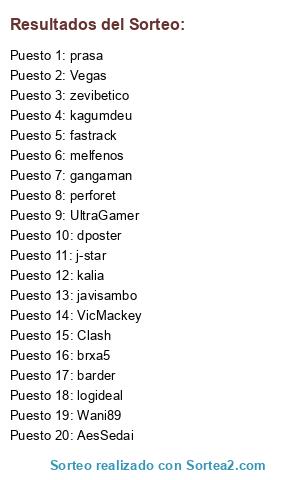 Lista de participantes: prasa (5 participaciones), melfenos (4 participaciones), brxa5 (3 participaciones), gangaman (2 participaciones), zevibetico (2 participaciones), Wani89 (2 participaciones), javisambo (2 participaciones), perforet (2 participaciones), kalia (2 participaciones), fastrack (2 participaciones), kagumdeu , dposter , Vegas , Clash , UltraGamer , barder , j-star , logideal , VicMackey , AesSedai.