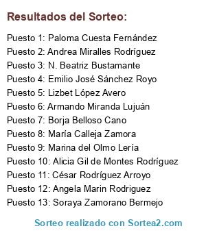 Lista de participantes: Ana Victoria Sánchez Bolaños, María Teresa Ascaso Barrena, Alejandro Méndez, Yesenia Acosta Benitez, Victoria Fernández Robles , Leire Larrañaga Doval, Icíar Tarascon Quintas, Lucía Piñero Álvarez, Ana Hernández Huete, Inés Murillo Clabo, Elena López García, Erika Rosario Caraballo, Álvaro Gutiérrez Antón, Virginia Nistal Martínez, Ramón, Peche Villarejo, Carlos Hernández Giménez, Sofía Bernardino Valadés, Sofía, Suárez Prat, Carolina Ferreiro Agüero, Sonia López Napoleon, Grecia Patricia Busquets Sifuentes, Ana González Núñez, Jessica Buil Sanz, Patricia Pradas Astorga, Lucía Alfonsín Otero, Azucena Chicharro Chinchilla, Laura Perea Álvarez , Cristina Cívicos Gutiérrez, Emilio José Sánchez Royo, Blanca Pesqueira Rocafort, Laura, Pajares Mendoza, Leticia Pascual Mariona, Laura Neira Montes, Macarena Gómez-Angulo Martínez-Verdú, Celia Jiménez Nacimiento, Beatriz Cadenas Fuente, Lizbet López Avero, Ana Isabel Aracil Belmonte, Brenda Inés Sánchez Santana, Jaime Castaño Ruiz, Idoia Castillo García, Paloma Cuesta Fernández, Elisa Navarro Calvo, María Torres López, Sandra Fuentetaja Álvarez, Ana Isabel Salamanca, Priscila Suárez Llobregat, Yolanda Rodríguez Martín, Andrea Miralles Rodríguez, Carmen Alcina Benavente, Carmen Martínez Bravo, Laura Piqueras Serrano, Paloma Rodríguez Fernández, Marta urrea Cruzado, Lara Benito Hernández, Alba Villameriel Muñoz, Marta Quesado Rosado, María González Dono, Ana Recio López, Alejandra Fernández Checa Rodríguez, Álvaro Sáez Martín, Borja Belloso Cano, Yasmin Ferreras Greenwood, Sebastián Matías Sandoli Álvarez, Maria Mulero Garcia, Sofía Margarita, Machado De Paz, Cristina, Ramírez Ramos, Rubén Sampietro Carrión, María Piedad Gonzalez Moreno, César Rodríguez Arroyo, Daniel Vaca Gómez, Carmen Romero Barragán, Suleima Palencia Ramírez, Eunice Ester Santana Rodriguez , Marina del Olmo Lería, Cristina Castro Oteo, Alicia Gil de Montes Rodríguez, Sofía Jara, Sergio, San Millán Álvarez, MIRIAM FRUTOS CALLEJA, Sara Díaz Pacheco, Ana Rodríguez Casquero, Rosa Larriba Guillén, María Calleja Zamora, Armando Miranda Lujuán, María de los Ángeles, Lorite Gutiérrez, Rodrigo Blazquez Rodríguez , Berta Peña Rambaldi, Enebral Sainz Vacas, Rocío Carranza Martínez, Nieves Gil Martín, Tania Rodríguez Piñero, Adrián Baquerizo McMillan, Soraya Zamorano Bermejo, Concepción Antón Oporto, Ana Pascual Cepas, Lucia Corrales García, Belén Delgado Olea, Sandra De Tena Gómez, Patricia Ochoa Rubio, SARA TRASCASAS ENCINAS, Carmen Morales Molina, Angela Marin Rodriguez, Cristina Panea Iglesias, Daniel Pastor Peño, María de la Concepción Herrera Crespillo, Laura Gil Calvo, Rafael Lázaro Machado, Dolores Vacas Pedemonte, Yolanda Moreno-Abadía Pérez, Beatríz Salmerón molina, Celia García García, Bárbara Castejón Golbano, Diego Benito Garcia, Maria Andres Martin, N. Beatriz Bustamante, Patricia Camino Batista, Laura Monleón de la Lluvia.