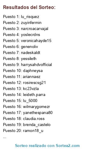 Lista de participantes: mely_13.08.2002 (2 participaciones), yoslecrdns (21 participaciones), gomezgng (3 participaciones), veronicahayde15 (58 participaciones), alehborjas (2 participaciones), irenemoran (2 participaciones), lissa14000 (12 participaciones), akire.ana (8 participaciones), rosasalcedo814 (2 participaciones), wilmarygomezr (2 participaciones), eliennys_valera (2 participaciones), anakarina_20 (2 participaciones), mandyalga (5 participaciones), lu_5000 (7 participaciones), valery.iris (3 participaciones), nadeskaldt (6 participaciones), brenda_castelo (2 participaciones), rosirescsg21 (7 participaciones), lilaloopez (3 participaciones), grameryss (2 participaciones), kellyrc15 (3 participaciones), kc23vzla (10 participaciones), dayanah_172 (2 participaciones), marijoarcila58 (3 participaciones), deina_maggio7 (2 participaciones), flaky_05 (2 participaciones), mary.antunez (3 participaciones), daphneysa (7 participaciones), genesisarauj (3 participaciones), narcroacarvajal (7 participaciones), zuyinfermin (5 participaciones), frannymorillo (4 participaciones), auravelasquez150 (2 participaciones), angelmi_80_ (2 participaciones), heileencabb (5 participaciones), margaretleal11 (4 participaciones), yanezestefany (3 participaciones), karenconk95 (2 participaciones), mariaaliciarodriguez (3 participaciones), lu_risquez (4 participaciones), yessileth (4 participaciones), decoracionesyos (5 participaciones), harrysahdvofficial (4 participaciones), ariannaez (6 participaciones), jainycamila1 (10 participaciones), eliannyvictoria28 (6 participaciones), tiffa26 (10 participaciones), maritzaerll (2 participaciones), ligia_figueroa5 (2 participaciones), lisbeidyzerpa (4 participaciones), gleissybjm (3 participaciones), rosalbacuadrado (4 participaciones), katerineg31 (3 participaciones), fernandalagrange (3 participaciones), anubissor (5 participaciones), alexay_g (8 participaciones), ysabeldvs (8 participaciones), yai.victoria (2 participaciones), bsjanne (4 participaciones), kathey_viloria (3 participaciones), andrysssc (2 participaciones), 63katisita (4 participaciones), ramon18_u (13 participaciones), yulainess (7 participaciones), caroligomess (2 participaciones), daliamv81 (4 participaciones), inawm1 (2 participaciones), mari_angelica80 (5 participaciones), nataliagonzalezd (2 participaciones), narcelis_mendoza (5 participaciones), kliscabeza (2 participaciones), darianamg28 (4 participaciones), _gabrielavelasquez (2 participaciones), mariitaygabriel (3 participaciones), leideth.parra (3 participaciones), aguilarvale (5 participaciones), yanethespana80 (10 participaciones), genenoliv (3 participaciones), vickytwilight18 (2 participaciones), yelit_mar (10 participaciones), kathzorelis (17 participaciones), garagedejoss (3 participaciones), edithead2704 (2 participaciones), cepeda_mairim (2 participaciones), isabelvalen_13 (2 participaciones), julixzamartinez (3 participaciones), krystinavelasquez (6 participaciones), imarul (3 participaciones), claudia.ross (3 participaciones), gabihernandezch (2 participaciones), celesteguer , celesteguer.