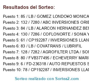 Lista de participantes: 6 / FD-236318 / AUTO REPUESTOS SAS / MUNDIAL, 61 / CP192287 / INVERSIONES LLANTAS CASA GRANDE / COOPAFA, 78 / CP192287 / INVERSIONES LLANTAS CASA GRANDE / COOPAFA, 80 / FVB377495 / ECHEVERRY MARISOL / PROCAR CUCUTA, 83 / LB / COVATRANS / LUBRIFIL, 84 / LB / ALARCON HERNANDEZ BENJAMIN / LUBRIFIL, 85 / LB / GOMEZ LONDO¥O MONICA / LUBRIFIL, 128 / 7282 / AGROFILTER LTDA / SONIA YANETH GARCIA, 130 / 7286 / COFLONORTE / SONIA YANETH GARCIA, 132 / 7280 / ABC INVERSIONES ORIENTE / SONIA YANETH GARCIA.