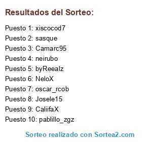 Lista de participantes: Javierj, n182_182, ThePlayeeRz, Extingido, kamicace1, Dj Cap, Dj Capa, MaGiik-VarO, MaGiik-VarOo, juanqui_rp, aLeex13, Marco, oscarmj11, xCrisT-, xCrisT-_, GDH6200, MisterAndAdri, PoKEnu, DanWork, Gornes_B, Cadel_dkv, Camarc95, pelicano_02, Canario_CreW, RICKY4BCN, siffty, oscar_rcob, Pakto96, AnSiA_RoTa, Opforen, Bryons, Nasbul, xSpanishSoldieRx, P-A-I-N-9618, ismael_focus, Spacer, PhOeNiX_Bo_99, Chocolatrix, Plamen_199, Plamen_1996, zSPiRiiT, CaliifaX, LosT-rivaaS, NeloX, marcosbt, xMandz, Varu_47, Mesu, Mesuz, Betorro, tehjokertoxiik, alvarohardy, Xx_MeRoT_xX, fran_escri, sanxix, xBeTox_96, Bohevi, alexpenya5, JORNADA16, DobleSe, Slar_9, misujin_o, Rakken, PUPOXX, alb_esp, Jorge_Spain, PacoMermela, iSeok, GUILLEE95, divy_A17, xiscocod7, pablillo_zgz, CintasS19, eny96, sanchoalag96, Dani_C, bugma, x1834', Piney01, iNauK-, Amap_98, Mozz, Mozzy, neirubo, kiamasu, LaPene, maalre, DeMuNs, pauete-6, xSniiPeeZz-, Djalbert1, Jokinzazpi, Yillen, xKillerz07, xinxe_, daviditoo7, adriangabu, eNNz0, Franblue11, alxoskate, longohero, KUN_Biboko, GameOveR, La-Penetrasa, aki-el-k-no-fuma, Eduardo0088, dantesko, kikext, FnaTikc, SAMUELRM, XxRubnxX, asiersarmi, Lukasone, ado30299, Ghostsoldier5, Râiddenz, tuso, nodas11, Nameless, markillosbm6, markillosbm69, hit-10, sasque, Casika, Deidara_Uchiha, juas-juas-xd, admin essential, JahLovE_1, J-O-R-G-E-4, AiToRPuZoL, Josele15, Double0PS, Felpemor, Pastorret, _MegaPeneGigantePentrador, I3uigues, josefon96-, er_lego, villaka1, byReealz, Dj_GNS, RadiiNiL, Sinesterw, Chulopu, juansanchez1993, Raulyuka, Hock, Lewisteige, Lewisteiger, raulpb00, spaider091, hp-pablillo, Supermantxitos, TheRuGaR, sergio-em17sas, elsnake88, SleepingCuriosity, d_predator_15, luffy96.