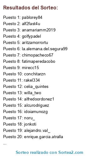 En el sorteo, los 10 primeros serán ganadores. Los siguientes son considerados reservas y se contactará con ellos en caso de ser necesario por el orden reflejado.