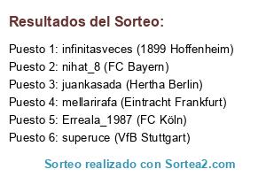 Lista de participantes: juankasada (Hertha Berlin), nihat_8 (FC Bayern), infinitasveces (1899 Hoffenheim), Erreala_1987 (FC Köln), mellarirafa (Eintracht Frankfurt), superuce (VfB Stuttgart).