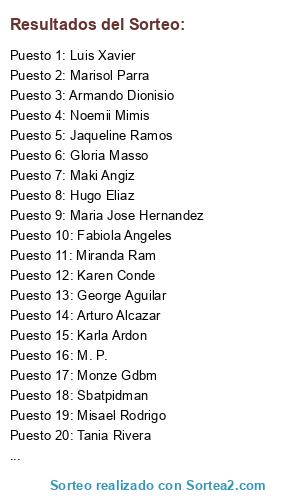 Lista de participantes: Fanny Estephania, Noemii Mimis, Luis Xavier, Armando Dionisio, Cecilia Janet, Karla Ardon, George Aguilar, Maki Angiz, Tania Rivera, Humberto Molina, Sergio Vite, Karen Conde, Diego Ivan, Monze Gdbm, Atzael Bastida, Erick Izarras, Misael Rodrigo, Ulizez Osornio, Gema Salazar, Fabiola Angeles, M. P., Sbatpidman, Gloria Masso, Gerardo Sanchez, Miranda Ram, Ernesto Flores, Luis Paz, Marisol Parra, Marie Rosas, Luis Gerardo, Arturo Alcazar, Oscar Martinez, Victor Leon, Alonso Dominguez, Maria Jose Hernandez, Fernando Silva, Frank Aldana, Diego Ramirez, Jaqueline Ramos, Jesus Josimar, Hugo Eliaz, Vero Martinez, Andrea Aguilar.