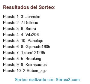 Lista de participantes: 1.dani121295, 2.Ruben_zgz, 3. Johnske, 4. Vilu206, 5. Breaking, 6. Sirera, 7 Delkicio, 8. Gijonudo1905, 9. Keirrisaurus, 10. Panelojo.