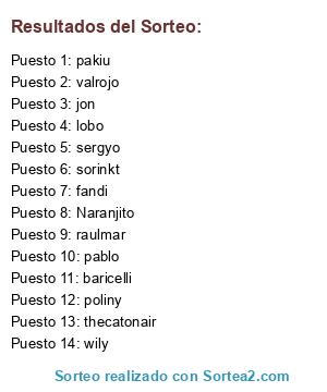 Lista de participantes: Naranjito, baricelli, pakiu, sorinkt, valrojo, fandi, jon, lobo, pablo, poliny, raulmar, sergyo, thecatonair, wily.