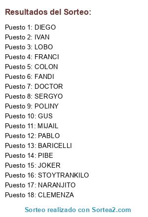 Lista de participantes: PIBE, STOYTRANKILO, DOCTOR, LOBO, DIEGO, NARANJITO, JOKER, GUS, PABLO, POLINY, MIJAIL, COLON, BARICELLI, IVAN, FANDI, FRANCI, SERGYO, CLEMENZA.