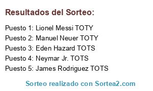 Lista de participantes: Lionel Messi TOTY, Eden Hazard TOTS, Manuel Neuer TOTY, James Rodriguez TOTS, Neymar Jr. TOTS.