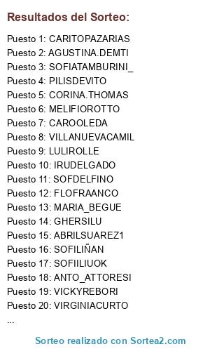 Lista de participantes: BIANFRANCESIO, CAROSAMPIETRO, MICABULSICCO (2 participaciones), GABRIELAPAITAN, GHERSILU (2 participaciones), PILISDEVITO, MERI.MARTIN, CAMI.SETTECASI, _POOOOLI, LOLACOSTA_, VIRMORRESI, BARBICANETE, CAMIMORRESI, AALEXIACORNEJO (2 participaciones), LUCIALANFRANCHI (2 participaciones), LULIMEDINA, BARBIRINALDI, SOFILIÑAN, MAARIFLOOR, ALEELINA, FLORBORTOLOTTO, JULIETAMILJEVIC, VALBALGORRIA, VICKYMINNITI, JULIFALCIGLIO, LULIKRIVOY, BELLETTIVALE, ZEPOL.ANERAK, IRUDELGADO, ANDYGATTINO, SOLANGEOSELLA, MELPEDRANI (2 participaciones), MORELLAMALLONI, SOFIMANGIA, ANTOCANELLO, MILIFAETI, LULIROLLE, CARITOPAZARIAS, SASHICASAS, CLAUSCLARA, CLARISA.PG, JULIAMBROSINI, CAMILAGENOUD, ORNERAFFO, AGUSBRUERA, MICASALGUERO, CATAMARTINEZPOK, JULFERRARII, MARIA_BEGUE (2 participaciones), PRISCILA.LUJAN, CORINA.THOMAS, FLORRFAA, FLOFRAANCO, MILAGROSSAITA, JAQUELINAORTEGA, ANTO_ATTORESI, JO_PEDRAZA, MELIFIOROTTO (2 participaciones), DAFFVIGABRIEL, AMSLERSARA, SOFICAST, _VICKYCAO, CASUORTEGA, SOFIAVIE, GIULIANASOLIER, LULI.ARMOCIDA, SOFIA RINALDI1, PALOMASANCHEZ96, MAIRAGIOSUE, SSOFIRODRIG (2 participaciones), FER.CALI, ZAIRASOLOHAGA, JULIDUENA, ABRILSUAREZ1, MARIANELAZULIANI, NNOEGOMEZ, FANY862001, NERISERVAN, CAROOLEDA, AGUSTINA.DEMTI, GIGIVERDUNA, AUGUSTINEMARCHAND, VICKYREBORI, MARTURANIERI, JOSEFINAFERREROG, MILIAZUUL, SOFIILIUOK, VIRGINIACURTO, AILU.LWT (2 participaciones), _ALINACOSTAMAGNA (2 participaciones), JULII.GHELFI, MARIUMASSARI (2 participaciones), VILLANUEVACAMIL, MILIDOMINGUEZ_, AGOURBANEJA, NATACHAGODOCIK, BORDETFER, ALINAZORAT, LUUHECKER, PAMEBAUEROK, CAMIIBREGY, MARTUSPECTORINS, GIULIMATTA, MILEPAIS, SOFIATAMBURINI_ (2 participaciones), SOLLLGAUNA, DANIELABONINO89, JANASLEPOY, CELEANDRES, PILUECHE, SOFDELFINO, BARBIAC, PAU_153, Sofi Ferraretto, mailen abigail quiroga, Leonor Ivaldi Artacho, Lisa Peluso.