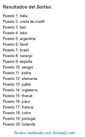 Lista de participantes: thecat, poliny, sergyo, bari, colon, fandi, pablo, naranjo, lobo, paco, brasil, italia, inglaterra, costa de marfil, alemania, holanda, francia, españa, argentina, portugal.