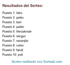 Lista de participantes: colon, sergyo, naranjito, pablo, fandi, bari, poli, lobo, thecatonair, pakiu.