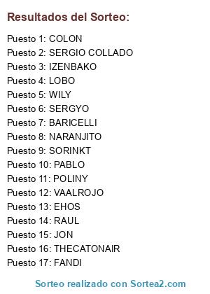 Lista de participantes: POLINY, RAUL, SERGYO, NARANJITO, PABLO, THECATONAIR, FANDI, VAALROJO, COLON, IZENBAKO, BARICELLI, EHOS, WILY, JON, SORINKT, LOBO, SERGIO COLLADO.