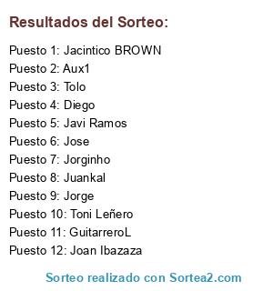 Lista de participantes: Javi Ramos, Juankal, Joan Ibazaza, Jorginho, Jacintico BROWN, Diego, GuitarreroL, Tolo, Jose, Toni Leñero, Jorge, Aux1.