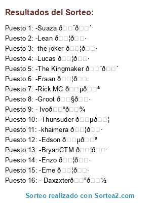 Lista de participantes: -Suaza 🇨🇴, -Fraan 🇦🇷, -Lucas 🇦🇷, -Edson 🇵🇪, -the joker 🇦🇷, -Enzo 🇦🇷, -khaimera 🇦🇷, - Ivo🇺🇾, - Daxzxter🇲🇽, -The Kingmaker 🇨🇴, -BryanCTM 🇦🇷, -Lean 🇦🇷, -Groot 🇧🇷, -Thunsuder 🇵🇦, -Eme 🇦🇷, -Rick MC 🇵🇪.