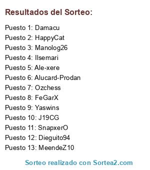 Lista de participantes: Ozchess, Alucard-Prodan, Ale-xere, Dieguito94, Damacu, Ilsemari, MeendeZ10, HappyCat, Manolog26, FeGarX, SnapxerO, J19CG, Yaswins.