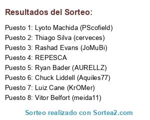 Lista de participantes: Lyoto Machida (PScofield), Ryan Bader (AURELLZ), Rashad Evans (JoMuBi), Thiago Silva (cerveces).