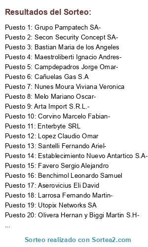 Lista de participantes: Secon Security Concept SA- (29 participaciones), Aserovicius Eli David (20 participaciones), Grupo Pampatech SA- (20 participaciones), PCgremio Computacion S.R.L.- (18 participaciones), Nolli Gerardo Ignacio (17 participaciones), Bastian Maria de los Angeles (10 participaciones), Adami de la Puente Hector Daniel- (9 participaciones), Avol SRL- (8 participaciones), Hardbug SRL (8 participaciones), Quick Informatica S.A (7 participaciones), Walker Alberto (6 participaciones), Grupo Hard S.A (6 participaciones), Argomys S.A- (6 participaciones), Febicom S.A- (5 participaciones), Utopix Networks SA (5 participaciones), Olivera Hernan y Biggi Martin S.H- (5 participaciones), Dps Tecnologia S.A- (5 participaciones), Melo Mariano Oscar- (4 participaciones), Rincon PC S A (4 participaciones), BDATA SA- (4 participaciones), Pildain Mirta Fabiola- (4 participaciones), Di Bella Gustavo Fabian- (4 participaciones), Larrosa Fernando Martin- (4 participaciones), Battaglini Pablo Fabian- (4 participaciones), Campdepadros Jorge Omar- (3 participaciones), Selva Claudio David-(3 participaciones), It Servicios SRL-(3 participaciones), Taboada Nestor Raul-(3 participaciones), Dimarcomp S.A-(3 participaciones), Raffo Javier Rodrigo-(3 participaciones), Fontela Karina Amelia(3 participaciones), Santulli Marcelo E. y Fernandez Adriana S.H(3 participaciones), Tindat SRL(3 participaciones), Servicios Tecnicos Informaticos S.R.L-(3 participaciones), Ciccarelli Pablo Dario-(3 participaciones), Techforce SRL-(3 participaciones), Dispositivos Electronicos SRL *(3 participaciones), Lopez Claudio Omar(3 participaciones), Rotelli Gaston Angel- (3 participaciones), Rivero Juan Pablo- (3 participaciones), Integracion Negocios Empresariales S.A (3 participaciones), Soave Marcos- (3 participaciones), Ortiz Matias Emiliano (3 participaciones), Tendex S.A- (3 participaciones), Giar Group S.A (2 participaciones), Favero Sergio Alejandro (2 participaciones), Micronova S.R.L- (2 participaciones), Netba S R L (2 participaciones), Neutro Informatica S.r.l * (2 participaciones), Vacotto Damian- (2 participaciones), Gutierrez Carrasco Sergio Angel- (2 participaciones), Becorp S.R.L- (2 participaciones), Scotton Dario- (2 participaciones), Consultora de Servicios It de Zona Norte Srl - (2 participaciones), De Martino Gabriel Alejandro- (2 participaciones), Grillo Mirta Noemi- (2 participaciones), Perez Ernesto Carlos- (2 participaciones), Brochetta Fabian Alfredo- (2 participaciones), Arta Import S.R.L.- (2 participaciones), Anyx SRL- (2 participaciones), Delumo Sergio Carlos- (2 participaciones), Blue Tree Technology S.A- (2 participaciones), Ibarz Enrique Manuel- (2 participaciones), Compufan srl- (2 participaciones), Sanchez Miguel Martin- (2 participaciones), Gutierrez Miguel Angel- (2 participaciones), Santelli Fernando Ariel- (2 participaciones), Grosso Jorge Luis- (2 participaciones), Perrone Patricio- (2 participaciones), Betancur Jose Santiago (2 participaciones), Tripodi Guido Agustin (2 participaciones), Hackers Tecno SH de Roldan y Barcos- (2 participaciones), Microlink S.A- (2 participaciones), Lipari Jose Maria- (2 participaciones), Amon Marcos- (2 participaciones), Seven It Solutions SRL- (2 participaciones), Valencia Alejandro Marcelo- (2 participaciones), Boyadjian Jorge Ricardo- (2 participaciones), Navarretta Nicolas- (2 participaciones), L y Belous Sistemas SRL- (2 participaciones), Kalik Pablo Prezioso Luis y Shestenge Diego SH- (2 participaciones), Carrion Marcelo Patricio- (2 participaciones), Establecimiento Nuevo Antartico S.A- (2 participaciones), Maeni Servicios Informaticos SRL (2 participaciones), Polcaro Andres- (2 participaciones), Granet SA- (2 participaciones), Tamborini Guillermo * (2 participaciones), Galarza Matias-, Masucci Estela-, Da Cunha M.,Ranea F.y Savini A. S.H.-, Bastarrica Martin Ignacio-, Nius Solutions SRL, Romero Mariano German, Riccio Guillermo Pedro-, El Gran Bill Sociedad de Responsabilidad Limitada, Pc Centro SRL, Carbone Omar Ariel, Diaz Claudio Martin*, Anconetani Marcelo Alejandro-, Regalado Roberto, Digital World SRL-, Moguilevsky Manuel Jaime-, Distribuidora Intercd S.A.-, Arman Claudio Alejandro-, Ondra SRL, Wasser Alberto Jorge-, Rodimax SA-, Wigdorovitz Philippe-, Tacco Calpini S.A-, Castellano Daniel *, Twoservers SRL-, Maestroliberti Ignacio Andres-, Dode-K-Edro S.A., Overdrive S.A-, Servicios Unidos de Seguridad S.A-, Marinelli Alejandro Matias-, Pantanetti Alejandro Carlo-, Sintes Alejo-, Parisi Pablo Andres-, Testa Hugo Ricardo-, Zarba Gonzalo Hernan-, Numir SRL-, Distribuidora GBS Srl-, Bianco German Antonio *, Unidad Coronaria Movil Quilmes S.A, Hotel Vicente Lopez S.A-, Adit Soluciones Informaticas S.R.L-, Albertini Pablo Ignacio-, Montajes Imeca S.A.-, Chami Diego Nicolas, Enterbyte SRL, COEZA S.A, La Barba Luis Alberto-, Gallardo Victor Manuel-, Benchimol Leonardo Samuel, Aguilera Juan Marcelo-, Bussolo Maria Jesus-, Carbone Adrian Roberto-, Intralogic S.A-, S C B SRL -, Anfer De Antonelli Ariel y Fernandez Ramiro-, Hity Desarrollo Inf y Creativo SRL, Sur Sistemas S.R.L.-, Cañuelas Gas S.A, Coronel Gabriel Carlos-, Piemonte Silvana, Wester Cinthia Karina-, Silvero Gerardo Martin, Graiver Daniel, Correa Walter Javier, Serrano Patricio Sebastian-, Barilari Jorge Luis, Corvino Marcelo Fabian-, Ms Informatica S R L-, Suarez Aldo David -, Gomez Leonardo Gaston -, Sejima Tecnologia S.R.L-, Pasquariello Orlando Gabriel-, Santa Catalina Daniel Domingo, Gateway SH de Bonelli G y Schiavello F-, Montemurro Leandro Daniel-, Garcia Dario Ernesto-, Maiante Diego-, Passalacqua Ricardo Adolfo-, Petraccaro Diaz Gustavo Javier-, Computacion Prisma SRL, Diaz Gonzalez Rodrigo Luis, Lin Arauco Alberto Wen Shon, Zucco Amalia Maria Rosario-, Nunes Moura Viviana Veronica, Ronin Technologies SRL, Echeverria Juan Carlos-, Colombo Santiago Ariel-, Zyrcon SRL-, Futuro S.R.L-, Lujan Sclavi Hugo Alejandro-, Caso Gustavo Adolfo-, Scaloni Daniel Omar-, Chiderski Roberto
