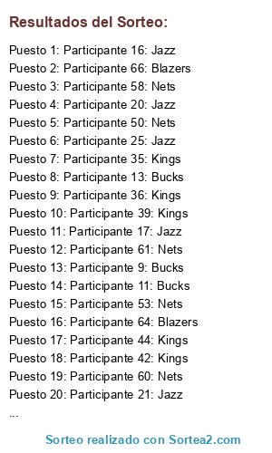 Lista de participantes: Participante 1: Bucks, Participante 2: Bucks, Participante 3: Bucks, Participante 4: Bucks, Participante 5: Bucks, Participante 6: Bucks, Participante 7: Bucks, Participante 8: Bucks, Participante 9: Bucks, Participante 10: Bucks, Participante 11: Bucks, Participante 12: Bucks, Participante 13: Bucks, Participante 14: Bucks, Participante 15: Bucks, Participante 16: Jazz, Participante 17: Jazz, Participante 18: Jazz, Participante 19: Jazz, Participante 20: Jazz, Participante 21: Jazz, Participante 22: Jazz, Participante 23: Jazz, Participante 24: Jazz, Participante 25: Jazz, Participante 26: Jazz, Participante 27: Jazz, Participante 28: Jazz, Participante 29: Jazz, Participante 30: Kings, Participante 31: Kings, Participante 32: Kings, Participante 33: Kings, Participante 34: Kings, Participante 35: Kings, Participante 36: Kings, Participante 37: Kings, Participante 38: Kings, Participante 39: Kings, Participante 40: Kings, Participante 41: Kings, Participante 42: Kings, Participante 43: Kings, Participante 44: Kings, Participante 45: Kings, Participante 46: Nets, Participante 47: Nets, Participante 48: Nets, Participante 49: Nets, Participante 50: Nets, Participante 51: Nets, Participante 52: Nets, Participante 53: Nets, Participante 54: Nets, Participante 55: Nets, Participante 56: Nets, Participante 57: Nets, Participante 58: Nets, Participante 59: Nets, Participante 60: Nets, Participante 61: Nets, Participante 62: Blazers, Participante 63: Blazers, Participante 64: Blazers, Participante 65: Blazers, Participante 66: Blazers, Participante 67: Blazers, Participante 68: Blazers.