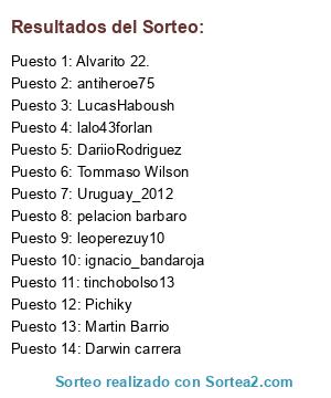 Lista de participantes: Darwin carrera, DariioRodriguez, antiheroe75, LucasHaboush, Martin Barrio, Uruguay_2012, pelacion barbaro, leoperezuy10, Pichiky, tinchobolso13, Alvarito 22., ignacio_bandaroja, Tommaso Wilson, lalo43forlan.