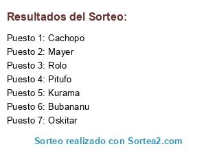 Lista de participantes: Bubananu, Cachopo, Kurama, Mayer, Oskitar, Pitufo, Rolo.