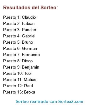 Lista de participantes: Pancho, Fabian, Broka, Gabriel, German, Raul, Tobi, Matias, Fernando, Benjamin, Diego, Bruno, Claudio.