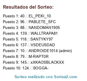 Lista de participantes: 1. ALEXSANFER11 (ADMIN), 2. ABRIXA9, 3. ADRIAN2401, 4. AGALLEGO10 (ADMIN), 5. ALEJANDROBM94, 7. ALEXSERRA1612, 8. ALFFOONSOO, 9. ANDRE2311XD, 10. ANDROIDE1014 (admin), 11. ANTONIOGA_1996, 12. ANTO-990, 13. ANTONIOJURADO_20, 15. BELLIO44, 16. BENRU 82, 17. BLASCO190, 19. BYSIITO, 20. CANILLEJO, 21. CARLOSXELES12345, 23. CH110INO, 24. CHERCHIRRACING, 25. CHEVITHA14, 27. CHIVI_007, 28. COPYMAR28, 29. CORTECERO11, 33. DAVILE07, 35. DISOLANO26, 36. DJ_DANI04, 37. DRIWERONE, 39. EL_KAIMO, 40. EL_PEKI_10, 42. ELTITO_JSVYTO, 44. ENLOVE181, 47. FERNANDO_7_13, 48. FLEKI_96, 50. FRANJIMENEZ6, 51. FURBI28, 52. GABI9989, 53. GINES1996VL, 54. GUILLEMLEVANTE, 55. GUILLESP_GSP, 56. HETI_69 (ADMIN), 57. HUESITO08, 58. ISESTR20, 60. JAVAGARCO, 64. EJOZELU14, 65. JORDILOIRE1, 66. JORGEPELOTOFI, 67. JOSELEUDS, 68. JOSELITOCUBA, 70. JUANBATLE55, 71. JUANKAR5, 72. JUANMA7_RM, 74. JZARETH, 76. LORENMG93, 77. LOSTRESSERDASOS, 78. LUISOCHE, 79. M-RAPT0R, 80. M2106995, 83. MARIOKING, 85. MARTA2790, 86. MICHI_CFTT, 87. NACOR-CHAMORRO, 88. NANDOMAN1905, 89. NANERASREADY033, 90. NEODUKE9, 91. NICO_1088_, 92. NOEL_MORENO, 95. ORTEGA178, 96. PABLETE_SFC, 97. PABLOBETICO96, 99. PAULXXX25, 100. PEDRITOSFC93, 103. PIKI9300, 104. PIXU-XIII (ADMIN), 106. POWERYET, 107. PUREMACHETE08, 110. RAYKOO666, 111. REVENGE-DIAMOND, 112. ROBECAI6, 113. RUBEN_ALEX_7, 114. RUBENIKE10, 115. RUMANACO1994, 116. SANDROSAMBA10, 118. SANTYKY97, 119. SENAA24, 121. SERGIOSH93, 122. SERGIOWD96, 124. SOGGA-, 125. SOLOZOMBIS1, 126. SPECTRO-_, 127. SSEEER1, 128. STFANO0424, 129. THEZULEEX, 130. TOPITO_WILLIAMS, 131. TWIRLYVIX, 133. ULTRA314, 134. URI14CASTELLER, 135. USE-9, 137. VSDEUSDAD, 138. WALIAJR, 139. WALLTRAPA81, 140. WHITEMIRE, 141. WILD2695, 142. XCRIIS._., 143. XOU86, 144. XRUBIO13, 145. xXKAOSBLACKXX, 146. XXMIGUELITTOXX, 147. YUSTA_RIAZA, 148. YUSTEALK, 149. ZXAVII18, 150. THEJOSKILLER, 151. MERENGOT, 154. DAVIDRPEREZ13, 155. FOXXTROXX, 156. JORGEPELOTOFI, 157. XKOKO79X, 158. PJ-MORENO, 159. ANOUAR_SM, 160. BBARTU9.