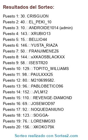 Lista de participantes: 1. ALEXSANFER11 (ADMIN), 2. ABRIXA9, 4. AGALLEGO10 (ADMIN), 5. ALEJANDROBM94, 8. ALFFOONSOO, 9. ANDRE2311XD, 11. ANTONIOGA_1996, 12. ANTO-990, 13. ANTONIOJURADO_20, 15. BELLIO44, 17. BLASCO190, 19. BYSIITO, 20. CANILLEJO, 21. CARLOSXELES12345, 23. CH110INO, 24. CHERCHIRRACING, 28. COPYMAR28, 29. CORTECERO11, 33. DAVILE07, 35. DISOLANO26, 37. DRIWERONE, 42. ELTITO_JSVYTO, 44. ENLOVE181, 47. FERNANDO_7_13, 48. FLEKI_96, 50. FRANJIMENEZ6, 52. GABI9989, 53. GINES1996VL, 54. GUILLEMLEVANTE, 55. GUILLESP_GSP, 56. HETI_69 (ADMIN), 57. HUESITO08, 58. ISESTR20, 60. JAVAGARCO, 64. EJOZELU14, 65. JORDILOIRE1, 66. JORGEPELOTOFI, 67. JOSELEUDS, 70. JUANBATLE55, 71. JUANKAR5, 72. JUANMA7_RM, 74. JZARETH, 76. LORENMG93, 77. LOSTRESSERDASOS, 78. LUISOCHE, 80. M2106995, 85. MARTA2790, 86. MICHI_CFTT, 87. NACOR-CHAMORRO, 89. NANERASREADY033, 90. NEODUKE9, 91. NICO_1088_, 92. NOEL_MORENO, 95. ORTEGA178, 99. PAULXXX25, 100. PEDRITOSFC93, 103. PIKI9300, 106. POWERYET, 107. PUREMACHETE08, 110. RAYKOO666, 111. REVENGE-DIAMOND, 112. ROBECAI6, 113. RUBEN_ALEX_7, 114. RUBENIKE10, 115. RUMANACO1994, 116. SANDROSAMBA10, 119. SENAA24, 122. SERGIOWD96, 125. SOLOZOMBIS1, 126. SPECTRO-_, 128. STFANO0424, 129. THEZULEEX, 130. TOPITO_WILLIAMS, 131. TWIRLYVIX, 133. ULTRA314, 135. USE-9, 138. WALIAJR, 140. WHITEMIRE, 142. XCRIIS._., 143. XOU86, 144. XRUBIO13, 146. XXMIGUELITTOXX, 148. YUSTEALK, 149. ZXAVII18, 150. THEJOSKILLER, 151. MERENGOT, 154. DAVIDRPEREZ13, 156. JORGEPELOTOFI, 159. ANOUAR_SM, 160. BBARTU9.
