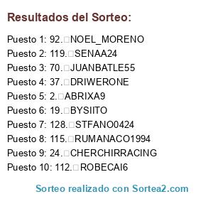 Lista de participantes: 2. ABRIXA9, 4. AGALLEGO10 (ADMIN), 17. BLASCO190, 19. BYSIITO, 24. CHERCHIRRACING, 29. CORTECERO11, 37. DRIWERONE, 70. JUANBATLE55, 71. JUANKAR5, 74. JZARETH, 92. NOEL_MORENO, 103. PIKI9300, 110. RAYKOO666, 112. ROBECAI6, 115. RUMANACO1994, 119. SENAA24, 126. SPECTRO-_, 128. STFANO0424, 130. TOPITO_WILLIAMS, 135. USE-9, 143. XOU86, 156. JORGEPELOTOFI, 160. BBARTU9.