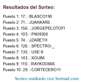 Lista de participantes: 4. AGALLEGO10 (ADMIN), 17. BLASCO190, 29. CORTECERO11, 71. JUANKAR5, 74. JZARETH, 103. PIKI9300, 110. RAYKOO666, 126. SPECTRO-_, 130. TOPITO_WILLIAMS, 135. USE-9, 143. XOU86, 156. JORGEPELOTOFI, 160. BBARTU9.