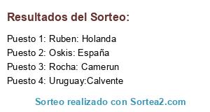 Lista de participantes: Adri: Grecia, Rocha: Camerun, Oskis: España, Ruben: Holanda, RubenyYuri: Francia, Suecia:Corpa, Uruguay:Calvente, Chile:Zizou.