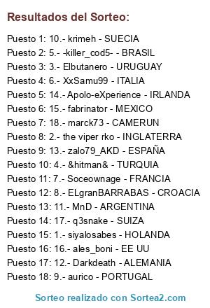 Lista de participantes: 1.- siyalosabes - HOLANDA, 2.- the viper rko - INGLATERRA , 3.- Elbutanero - URUGUAY, 4.- &hitman& - TURQUIA, 5.- -killer_cod5- - BRASIL, 6.- XxSamu99 - ITALIA, 7.- Soceownage - FRANCIA, 8.- ELgranBARRABAS - CROACIA, 9.- aurico - PORTUGAL, 10.- krimeh - SUECIA, 11.- MnD - ARGENTINA, 12.- Darkdeath - ALEMANIA, 13.- zalo79_AKD - ESPAÑA, 14.- Apolo-eXperience - IRLANDA, 15.- fabrinator - MEXICO, 16.- ales_boni - EE UU, 17.- q3snake - SUIZA, 18.- marck73 - CAMERUN.