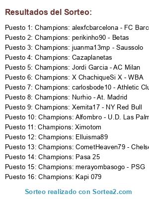 Lista de participantes: Champions: perikinho90 - Betas, Champions: Elluisma89, Champions: Alfombro - U.D. Las Palmas, Champions: Cazaplanetas, Champions: Xemita17 - NY Red Bull, Champions: Pasa 25, Champions: CometHeaven79 - Chelsea FC, Champions: Kapi 079, Champions: merayombasogo - PSG, Champions: Ximotom, Champions: juanma13mp - Saussolo, Champions: carlosbode10 - Athletic Club de Bilbao, Champions: Jordi Garcia - AC Milan, Champions: alexfcbarcelona - FC Barcelona, Champions: Nurhio - At. Madrid, Champions: X ChachiqueSi X - WBA.