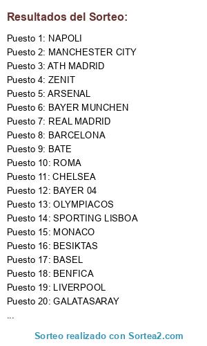 Lista de participantes: LILLE, NAPOLI, ZENIT, REAL MADRID, BARCELONA, BAYER MUNCHEN, CHELSEA, ATH MADRID, BENFICA, ARSENAL, SCHALKE 04, BORUSSIA DORTMUND, JUVENTUS, PSG, SHACKTHAR DONESTK, BASEL, MANCHESTER CITY, BAYER 04, OLYMPIACOS, CSKA MOSKUO, AJAX, LIVERPOOL, SPORTING LISBOA, GALATASARAY, ROMA, ATH BILBAO, ANDERLECH, APOEL, BATE, BESIKTAS, MARIBOR, MONACO.