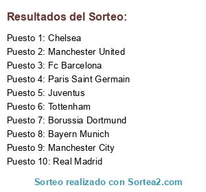 Lista de participantes: Manchester City, Juventus, Fc Barcelona, Real Madrid, Bayern Munich, Borussia Dortmund, Tottenham, Chelsea, Paris Saint Germain, Manchester United.