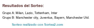 Lista de participantes: Manchester Utd., Manchester city, Inter, Milan, Bayern, Lazio, Juventus, Tottenham.