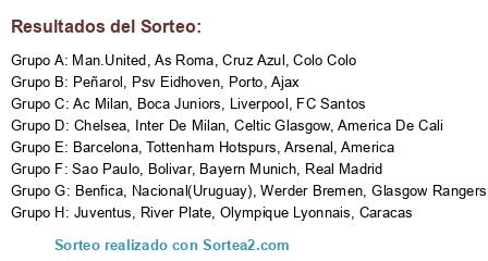 Lista de participantes: Real Madrid, Ac Milan, Man.United, Juventus, Barcelona, Inter De Milan, Arsenal, Liverpool, Bayern Munich, Ajax, Porto, Benfica, Olympique Lyonnais, As Roma, Psv Eidhoven, Celtic Glasgow, Werder Bremen, Glasgow Rangers, Chelsea, Tottenham Hotspurs, Boca Juniors, Sao Paulo, America De Cali, America, Colo Colo, Nacional(Uruguay), River Plate, Bolivar, Caracas, Peñarol, FC Santos, Cruz Azul.