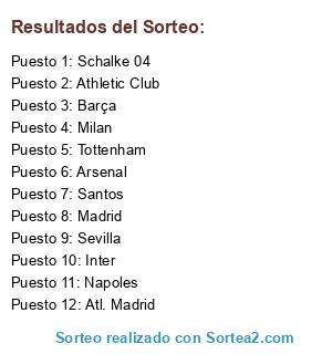 Lista de participantes: Atl. Madrid, Schalke 04, Napoles, Athletic Club, Barça, Milan, Inter, Madrid, Santos, Tottenham, Sevilla, Arsenal.