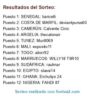 Lista de participantes: ARGELIA: thecatonair, CAMERÚN: Calvente Civic, COSTA DE MARFIL: deviantpurse60, EGIPTO: slassi14, GHANA: Erchuliyo 24, MALI: exposito11, MARRUECOS: WILLY18 T9R10, NIGERIA: FANDI 87, SENEGAL: baricelli, SUDÁFRICA: raulmar, TOGO: aitorr92, TUNEZ: Murill069.