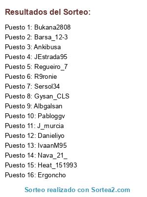 Lista de participantes: Regueiro_7, Heat_151993, Bukana2808, Barsa_12-3, Danieliyo, J_murcia, Sersol34, JEstrada95, Albgalsan, Nava_21_, R9ronie, Ankibusa, IvaanM95, Gysan_CLS, Ergoncho, Pabloggv.