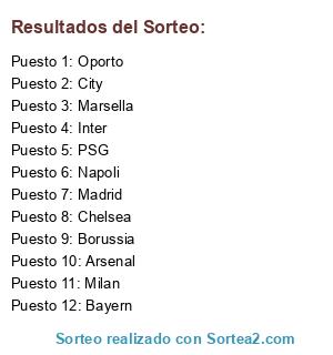 Lista de participantes: Marsella, Borussia, Milan, PSG, Napoli, Inter, Bayern, Arsenal, Oporto, Madrid, Chelsea, City.