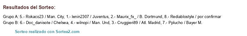 Lista de participantes: 1.- lenin2307 / Juventus, 2.- Maurix_fx_ / B. Dortmund, 3.- Cruggieri89 / Atl. Madrid, 4.- wilnopi / Man. Und, 5.- Rokaco23 / Man. City, 6.- Doc_danisote / Chelsea, 7.- Pplucho / Bayer M., 8.- Rediablostyle / por confirmar.