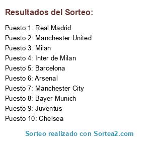 Lista de participantes: Real Madrid, Barcelona, Bayer Munich, Chelsea, Manchester United, Manchester City, Arsenal, Milan, Inter de Milan, Juventus.